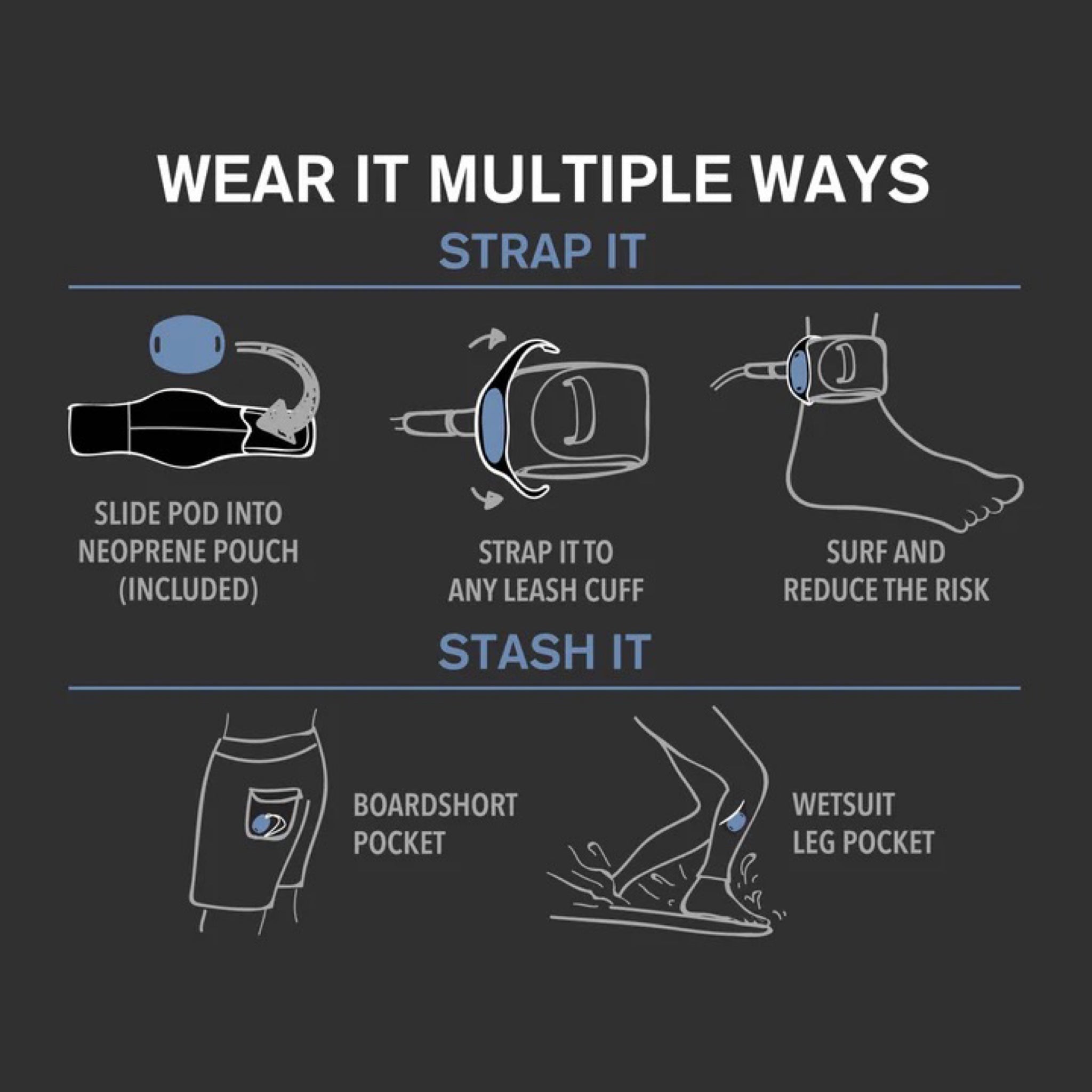 Designed to integrate seamlessly with your setup, the POD straps directly to your leash cuff using the included FCS Surf Pouch accessory. Lightweight, low-profile, and always on, it won’t interfere with your performance, ; just your peace of mind.