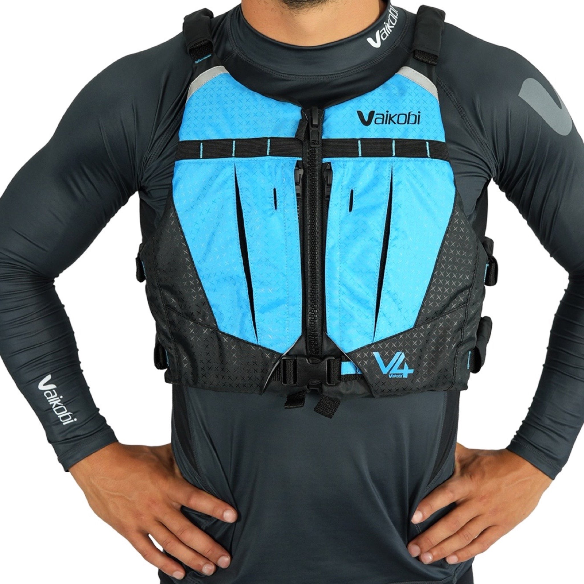 The Vaikobi V4 OCEAN RACING PFD feature front zip pockets a mesh gusset and heavy duty plastic vison zippers for added durability. These front pockets provide 40% more storage capacity compared to previous versions.